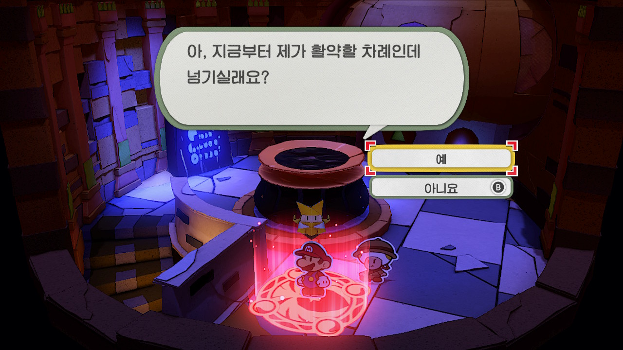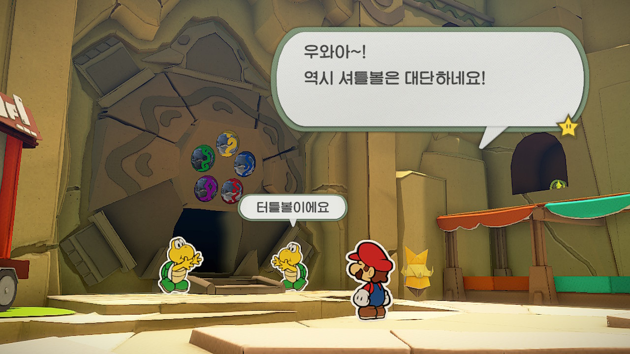 이전 작품들이 얼마나 유저-프렌들리한 UX를 지녔는지는 알 수 없지만, [슈퍼 페이퍼 마리오] 때의 경험으로만 미루어 보았을 때는 수집 등의 파고들기 요소를 100% 만족하기는 다소 어려웠다. 물론 수집품의 목록 등은 확인할 수 있으나 어느 지점에서 어떻게 얻어야 하는지는 공략을 보지 않으면 어려운 수준이었다. [종이접기 킹]은 이러한 면에서 편의성을 극대화한 작품이 아닌가 싶다.