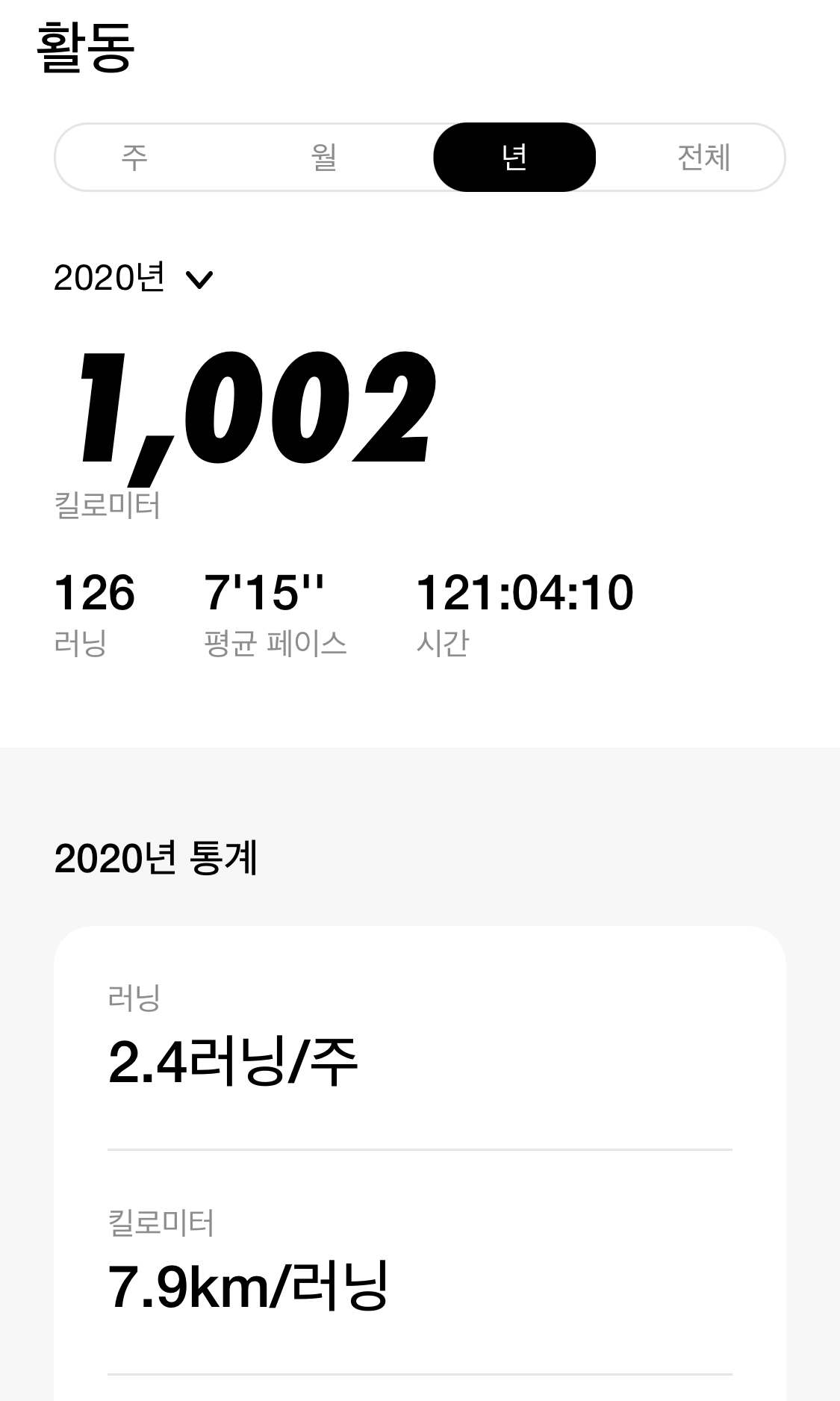 내 러닝의 모토는 얼마나 빠른 속도로 뛰느냐가 아니라 얼마나 건강하게 뛰는가이다. 기록의 한계가 계기는 되었지만 기록을 더 내고 싶어서가 아니라 살을 빼고 몸을 건강하게 만들고 싶어서 운동을 시작한 것이기 때문에 절대 무리하며 달리고 싶지는 않았다. 사실 몸이 많이 무거운 편이기 때문에 속도를 내고 싶어도 내 다리의 건강을 고려해서 천천히 그리고 오래 달리는 쪽으로 노선을 잡기도 했다. 이러한 점에서 착안하여 러닝 내내 뛰기만 하는 것이 아니라 일정 간격을 두어 걸으면서 쿨링 다운을 하기도 한다. 그래야 다리에 걸리는 부하가 줄고 보다 더 오래 뛸 수 있기 때문이다. 결국 속도보다는 뛴 거리에 중점을 두며, 앱에 운동을 매번 기록하여 거리를 차곡차곡 적립하는 느낌으로 뛰었다. 그래서 평균 속도는 약간 욕심 내서 달리면 6'30" 정도, 보통 10km를 뛰면 7'00" 전후로 나온다. 그렇게 4월 말부터 뛰기 시작하여 12월 말까지, 올 한해동안 1,000km를 뛰는데 성공했다. 약 200km때부터 100km 간격으로 인스타 스토리에 흔적을 남겼는데 거의 대부분 4주 이내로 100km를 채우더라. 당직 등으로 러닝머신을 이용할 때면 10km가 찍힐 때까지 뛰고, 보통 퇴근 후에 야외에서 뛰면 7.3km정도 뛰다가 코스를 조금 늘려 8km를 채우는 중이다. 물론 출근 해서도 체련이면 연병장에서 10km를 채운다.