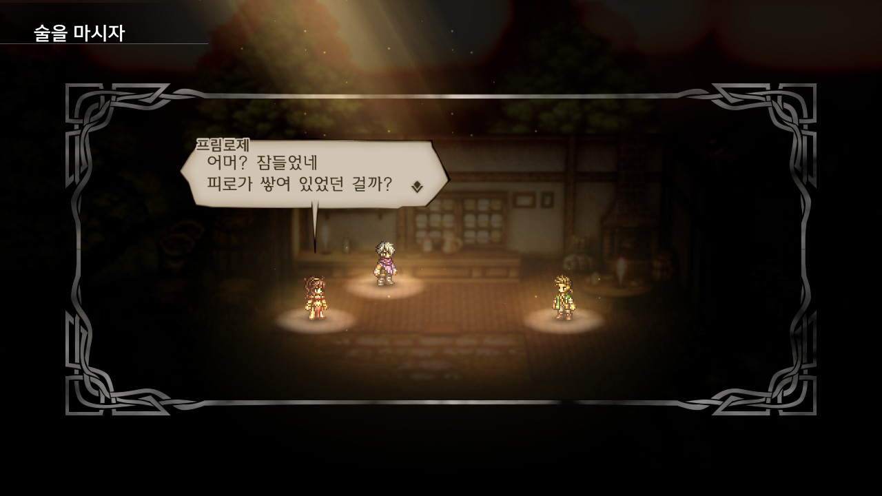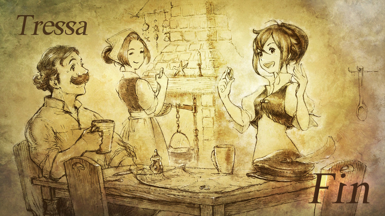 - 게임 내내 별 볼 일 없는 스토리가 아쉬웠지만 모든 캐릭터의 엔딩을 보고 진입할 수 있는 최종장을 통해 전개되는 연출은 좀 좋았다. '결국엔 그놈이 그놈' 엔딩인 것도 좋았고, '그놈'으로 여덟 명의 스토리가 한 데 얽히는 것도 좋았고, 사실 사이드 퀘스트 진행 중 별 볼 일 없었던 NPC가 모든 일의 원인이 된 진정한 흑막이었다 하는 반전도 마음에 들었다. 하지만 도리어 최종장에 다다라서 터트릴 것이 아니라 메인 스토리 자체를 좀 힘있고 치밀하게 구성했으면 어땠을까 하는 아쉬움이 남는다. 추진력을 위해 무릎을 꿇는 것(#)도 아니고...