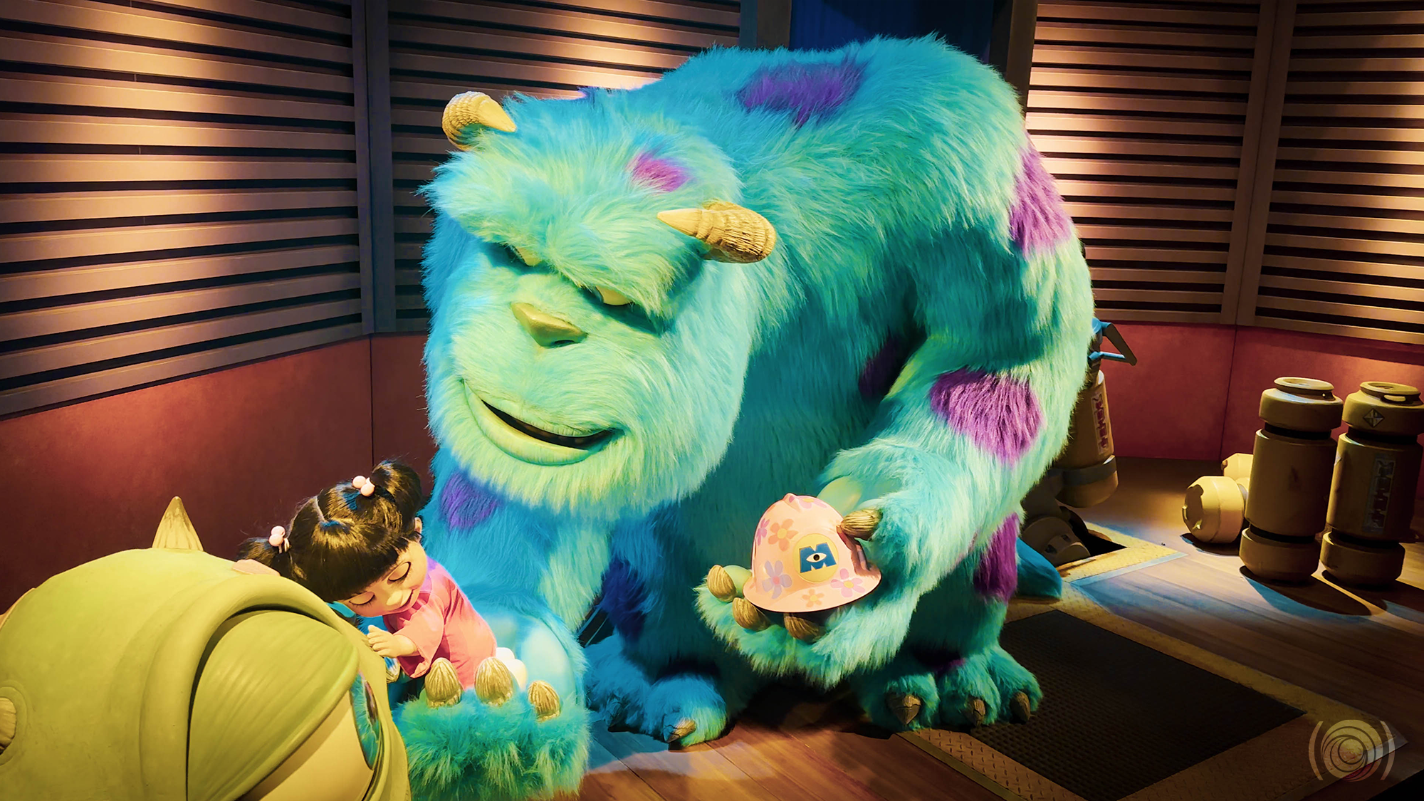 - 몬스터 주식회사 '라이드&고 시크!' : 다크라이드를 타며 손전등으로 헬멧을 비추면 숨어 있던 몬스터가 튀어나오는 방식. 생각보다 손전등 인식이 안 좋아서 어트랙션을 통해 이야기에 참여하는 느낌이 잘 안 든다. 이 어트랙션의 가장 유명한 포인트는 어트랙션 후반 설리번이 부를 안아 올리는 씬에서 나오는 문이다. 문 뒤에 공간이 없지만 마치 공간이 있는 것처럼 보인다. 거울을 이용한 착시라고 하는데 원리가 뭔지 아무리 생각해도 잘 모르겠다. 여튼 전반적으로 기대에 미치치 못하는 어트랙션이라 조금 실망이었음. 그나마 재밌는 건 다크라이드 타는 중의 모습을 탑승이 끝난 후 사진으로 확인할 수 있다.