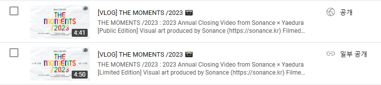 유튜브 업로드 시 명칭에 대한 고민이 조금 있었다. 한국말로 내수용 외수용이지만 이걸 그대로 영어로 옮길까 하다가, 공개/비공개의 의미를 담은 Opened/Closed를 쓸까 하다가, 결국엔 Public/Limited라고 썼다. 내수용은 일부 공개로 링크가 있는 사람들만 볼 수 있고 내수용만의 컷 혹은 쿠키영상도 있으니 limited라는 표현은 맞는 것 같다.