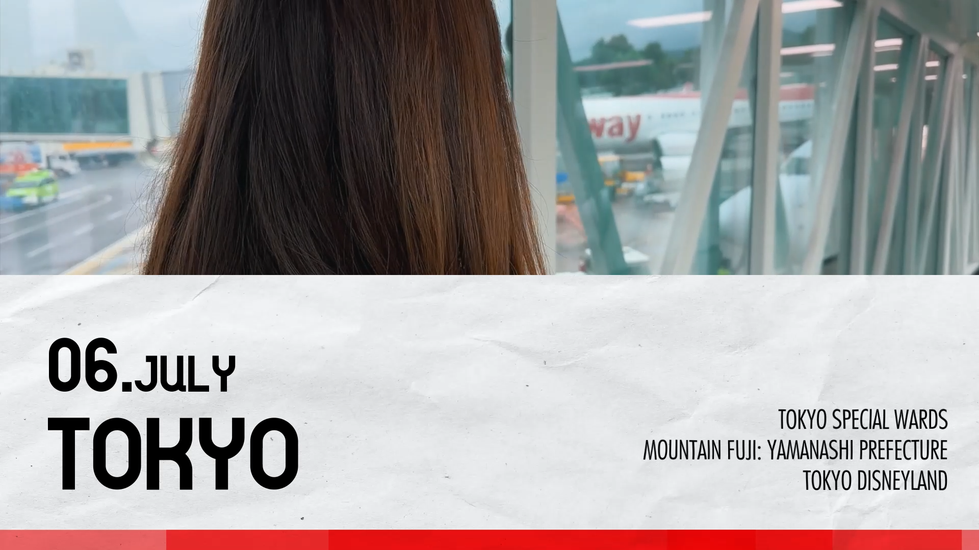 이번에는 사건의 구분과 더불어 시기 등의 정보와 사건의 큰 정보를 모두 담기 위해 반쪽짜리 배너를 활용했다. 배너는 종이 텍스쳐 소스에 모션을 준 컬러 바를 multiply로 얹어 덜 심심하게 했다. 컬러 바의 색은 타이틀 로고처럼 다채로운 느낌을 주기 위해 파트마다 다른 색깔을 썼다. 색깔마다 각각 의미가 있는 것도 있고 없는 것도 있다. 03) 경주는 벚꽃놀이 하러 갔으니깐 핑크, 06) 도쿄 여행은 일본 국기에서 착안한 빨간색, 07) 요시다 유니 전시회는 트럼프 카드를 시각화한 전시의 메인 컬러 붉은색과 보라색 중 도쿄 파트에서 사용한 붉은색을 제외한 보라색, 08) 가창은 단풍구경하러 갔으니깐 주황색, 09) 기타 파트는 여러 시기를 모아 놨으니 여러 가지 색으로 구성했다. 01) 서울 나들이, 02) 북큐슈 여행, 04) 2주년, 05) 수집가(=이건희) 전시회는 별 의미 없이 그냥 색깔이 이뻐 보이는 것 같아서 썼다. 지금에 와서 아쉬운 건 모션이 없으니 좀 심심한 느낌이 들고(처음엔 배너 전체에 모션을 주려고 했다가 생각했던 대로 모션이 안 나오길래 그냥 정적인 배너로 바꾸었다), 배너와 영상 사이에 스트로크를 좀 줘서 영역을 구분했더라면 더욱 좋았을 것 같기도 하고, 그 이전에 배너라는 요소 자체가 좀 촌스러운 것 같기도 하고... 다음엔 좀 더 트렌디한 방향으로 개선을 해 보자.