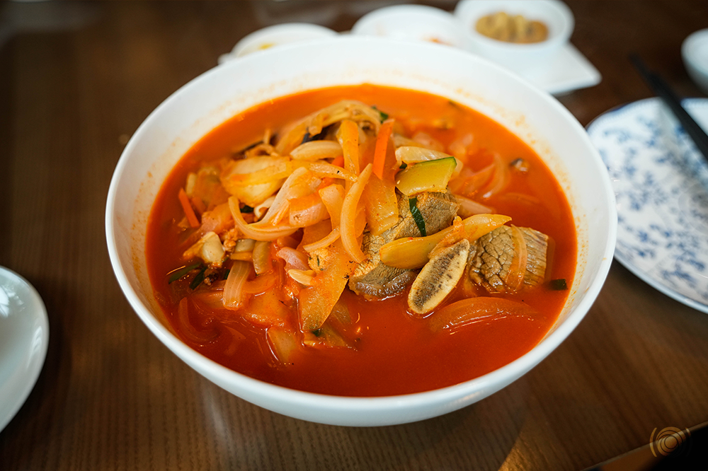 소갈비 짬뽕은 해물 베이스의 국물이다. 살짝 칼칼하면서도 산뜻하고 담백한 느낌. 해물이 그렇게 많은 것은 아니라 아쉽지만 토핑으로 한우 갈빗대가 세 덩이 있다. 갈비는 잘 익혀 놓아서 갈빗대에서 고기가 부드럽게 빠진다. 씹을 때도 전혀 질김이 없다. 해물 베이스에 소고기 토핑은 뭔가 맞지 않는 듯하지만 실제로는 서로 모나지 않게 잘 어울려서 좋다.