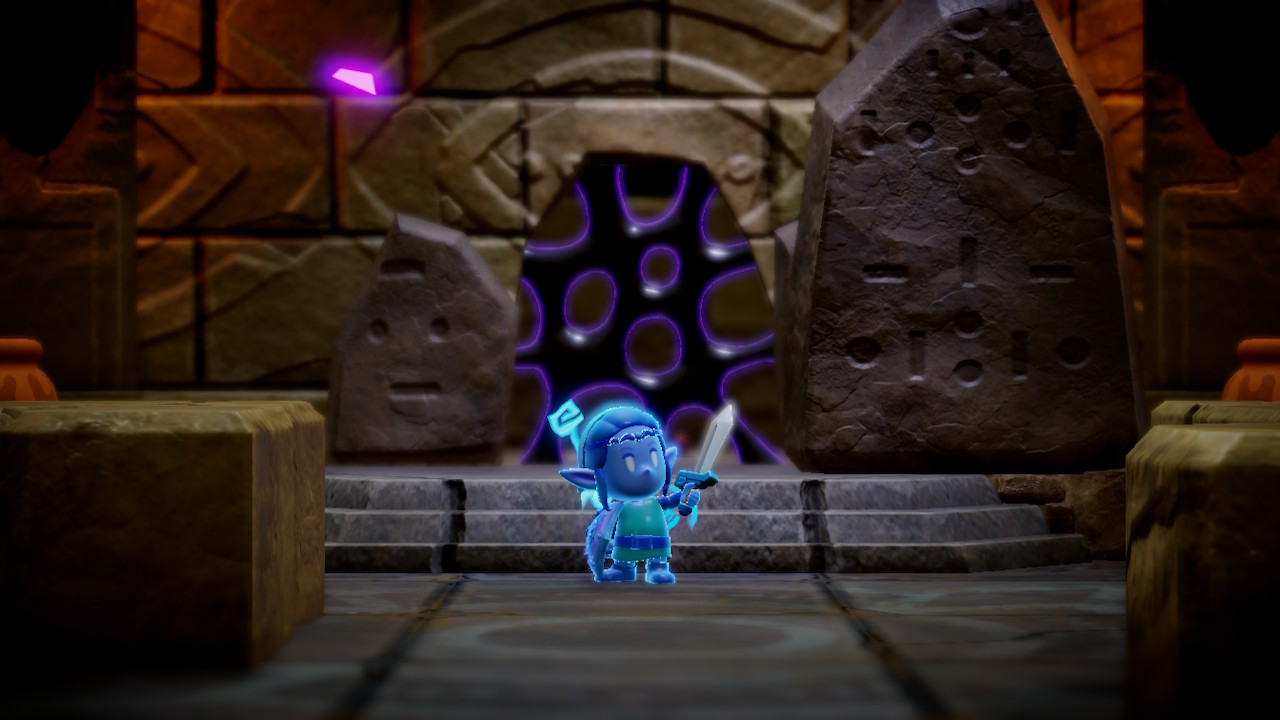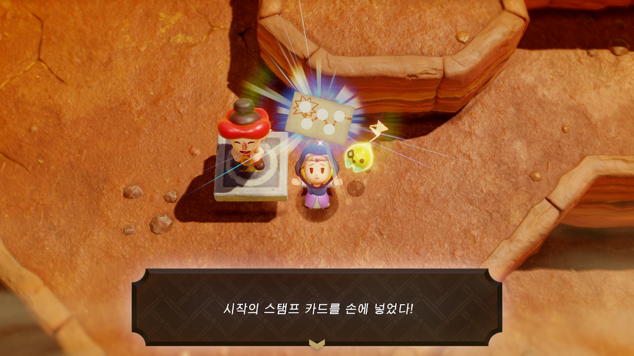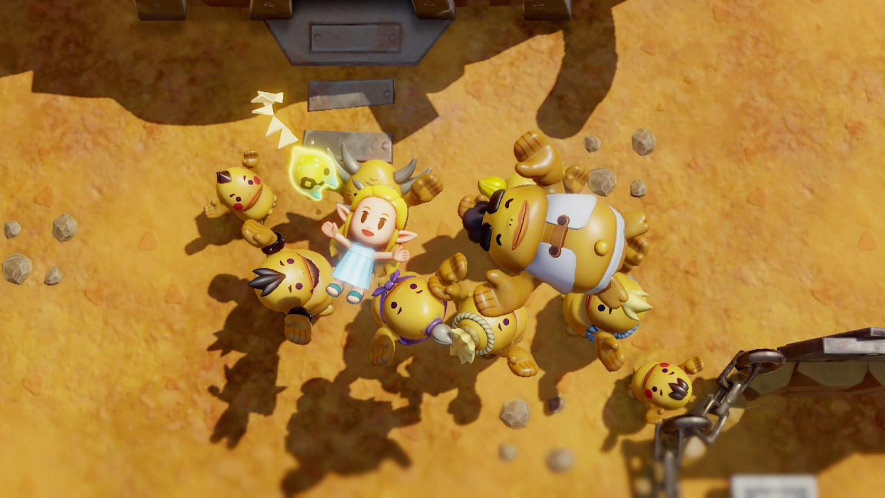 앞서 말했듯 작품은 젤다를 위주로 전개된다. 젤다가 아니라 오히려 링크가 봉인되어 있는 젤링역전세계다. 하지만 플레이 내내 링크가 젤다로 바뀌어서 느껴지는 이질감은 없다. 플레이의 줄기가 같기 때문이다. 젤다는 이전 시리즈의 링크처럼 하이랄을 탐색하며 곳곳에 산재해 있는 골칫거리들을 해결하고 더욱 큰 힘을 얻어 거대한 적에게 맞선다. 그 과정 가운데 겪는 액션과 퍼즐도 이전의 맛과 크게 다르지 않다. 그래서 주인공만 젤다로 바뀐 젤다 게임을 하는 느낌이다. 더불어 작품 초반 젤다가 주워 쓰는 링크의 후드는 시각적 동질감을 챙겨 주는 포인트다.