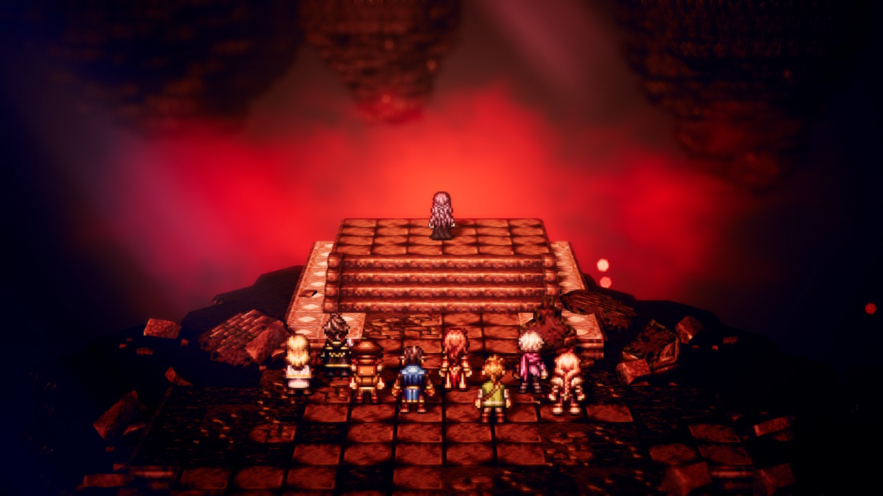 - 게임 내내 별 볼 일 없는 스토리가 아쉬웠지만 모든 캐릭터의 엔딩을 보고 진입할 수 있는 최종장을 통해 전개되는 연출은 좀 좋았다. '결국엔 그놈이 그놈' 엔딩인 것도 좋았고, '그놈'으로 여덟 명의 스토리가 한 데 얽히는 것도 좋았고, 사실 사이드 퀘스트 진행 중 별 볼 일 없었던 NPC가 모든 일의 원인이 된 진정한 흑막이었다 하는 반전도 마음에 들었다. 하지만 도리어 최종장에 다다라서 터트릴 것이 아니라 메인 스토리 자체를 좀 힘있고 치밀하게 구성했으면 어땠을까 하는 아쉬움이 남는다. 추진력을 위해 무릎을 꿇는 것(#)도 아니고...