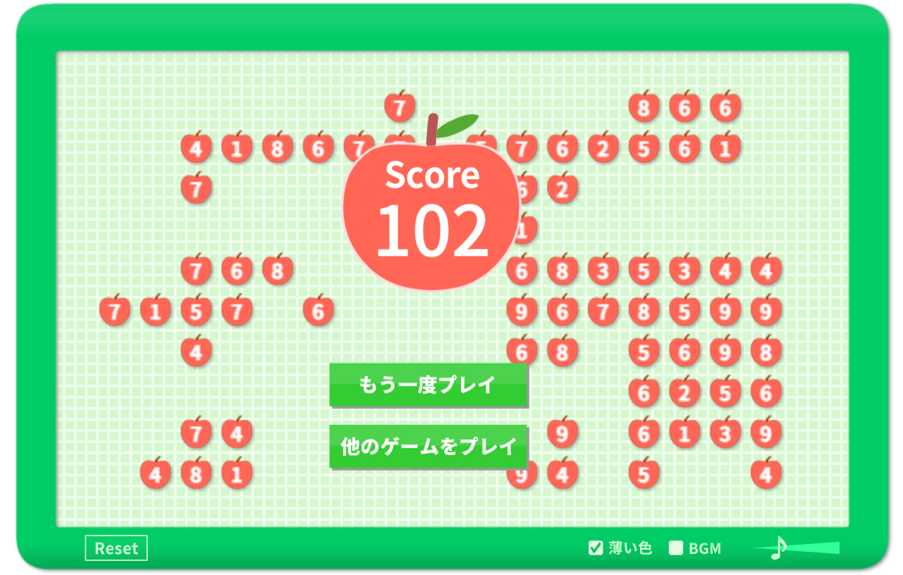 일명 사과 게임. 드래그를 해서 드래그 박스 안 사과의 숫자 총합을 10으로 맞추면 사과가 소멸하며 사과 1개당 1점씩 득점함.
