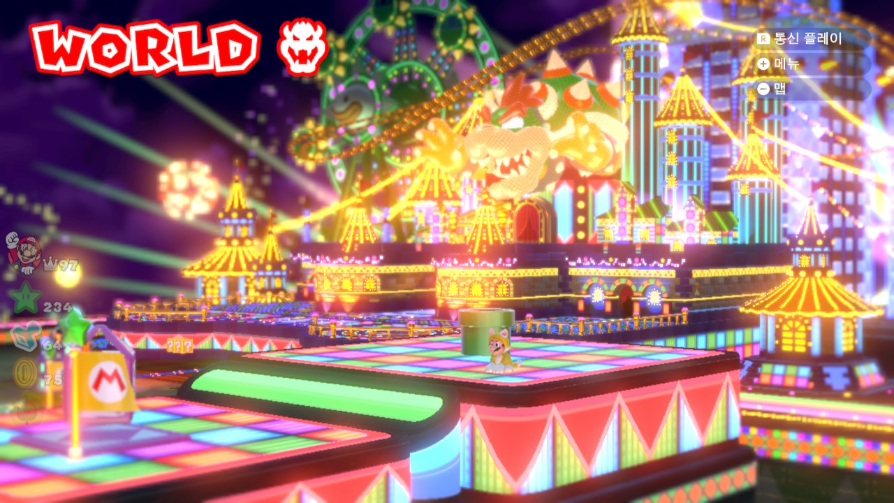 국내에는 WiiU가 정발되지 않았다. 정발되지도 않았던 위유를 구하고 싶었던 이유가 딱 두 가지 있었는데 하나는 <슈퍼마리오 메이커>였고(역설적이지만 난 아직도 슈마메2를 플레이하지 않고 있다), 나머지 하나가 바로 이 <슈퍼 마리오 3D 월드>였다. 마삼월의 전작인 <슈퍼 마리오 3D 랜드>는 3DS의 런칭 타이틀로 이미 즐겨보았지만 마삼월은 국내에서는 할 방법이 없었다. 그래서 한때는 중고나라를 뒤적거리던 때도 있었는데 그런것 치고는 사고자 하는 의지는 그다지 크지 않았더랬다. 역으로 생각을 해 보면 위유는 앞서 말한 타이틀들 이외에는 그다지 할만한 것들이 없었다. 이식작 이외에는 젤다 신작도 딱히 없고, 포켓몬은 계속 3DS 라인으로 나오고 있었고. 알면 알수록 위유가 망유소리 듣는 이유를 직접 기기를 소유하지 않고도 체감할 수 있었다. 닌텐도 콘솔은 마리오-젤다-포켓몬만 충실히 돌려도 제값은 한다고 느껴 왔는데 이 위유는 마리오 머신으로도 제대로 못 즐길 것 같으니 들이는 돈이 약간 아깝다는 생각이 들었지. 그래서 고민만 하다가 말았고 위유는 기억 저편으로 날려버렸다. 이후로도 위유는 처음부터 끝까지 킬러 타이틀 없이 어중간한 위치만 유지하고 있었고, 그 상태에서 스위치가 출시되며 위유는 사망선고를 받았다. 스위치 런칭 타이틀이었던 마카8 디럭스를 보면 이후 수많은 위유 타이틀이 이식되어 나오겠다는 예상은 충분히 할 수 있었다. 아니나 다를까... 수많은 이식작 중에 이 마삼월도 결국엔 등장을 하더라. 존버 성공ㅎ