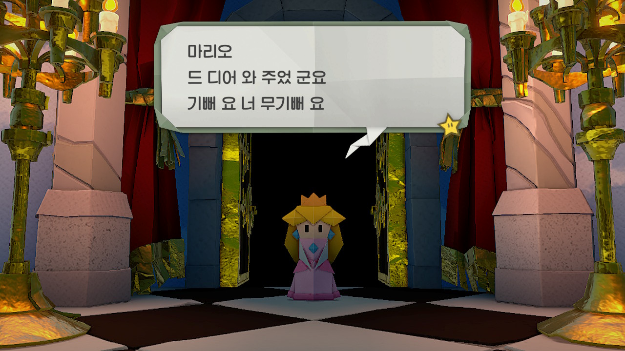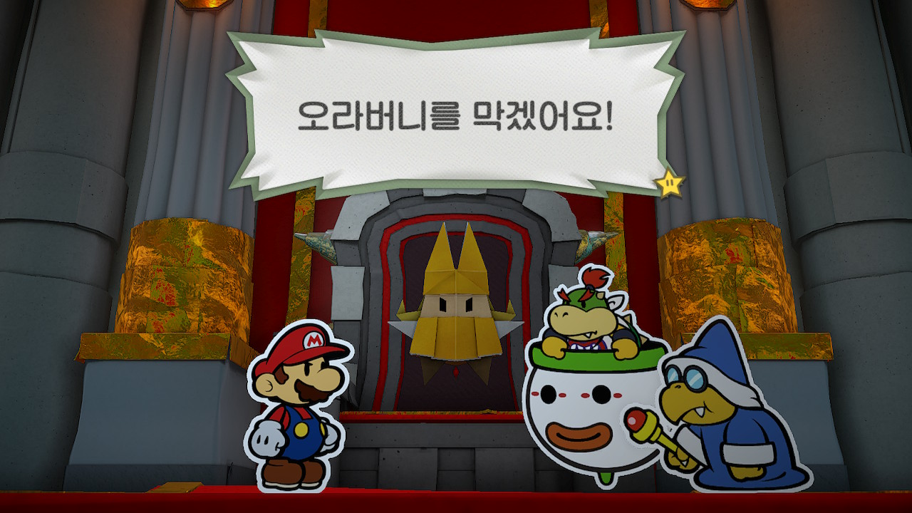 내 두 번째 페이퍼 마리오 시리즈이다. 첫 번째는 마리오 25주년 패키지를 샀더니 사은품으로 딸려 들어왔던 [슈퍼 페이퍼 마리오]였는데 그때 좋은 경험이 있어서 이 블로그에 후기(1)(2)도 남겼더랬지. 이후에 [스티커 스타]니 [컬러 스플래시]니 후속작이 몇 개 나온 것 같지만 해 보지는 않았고, 지금 대충 쓱 보니 평도 그렇게 썩 좋지는 아니올시다 인 것 같다. 여하튼 제쳐두고, [종이접기 킹]이 새로 발매를 하는데 나는 [슈퍼 페이퍼 마리오] 때의 기억 하나만으로 구매를 결정했다. 혹자는 이런 류의 게임은 발매 후 평점을 확인하고 구매를 결정해야 한다지만 깔끔하게 무시하기로 했고, 결론부터 말하면 대성공인 것 같다.