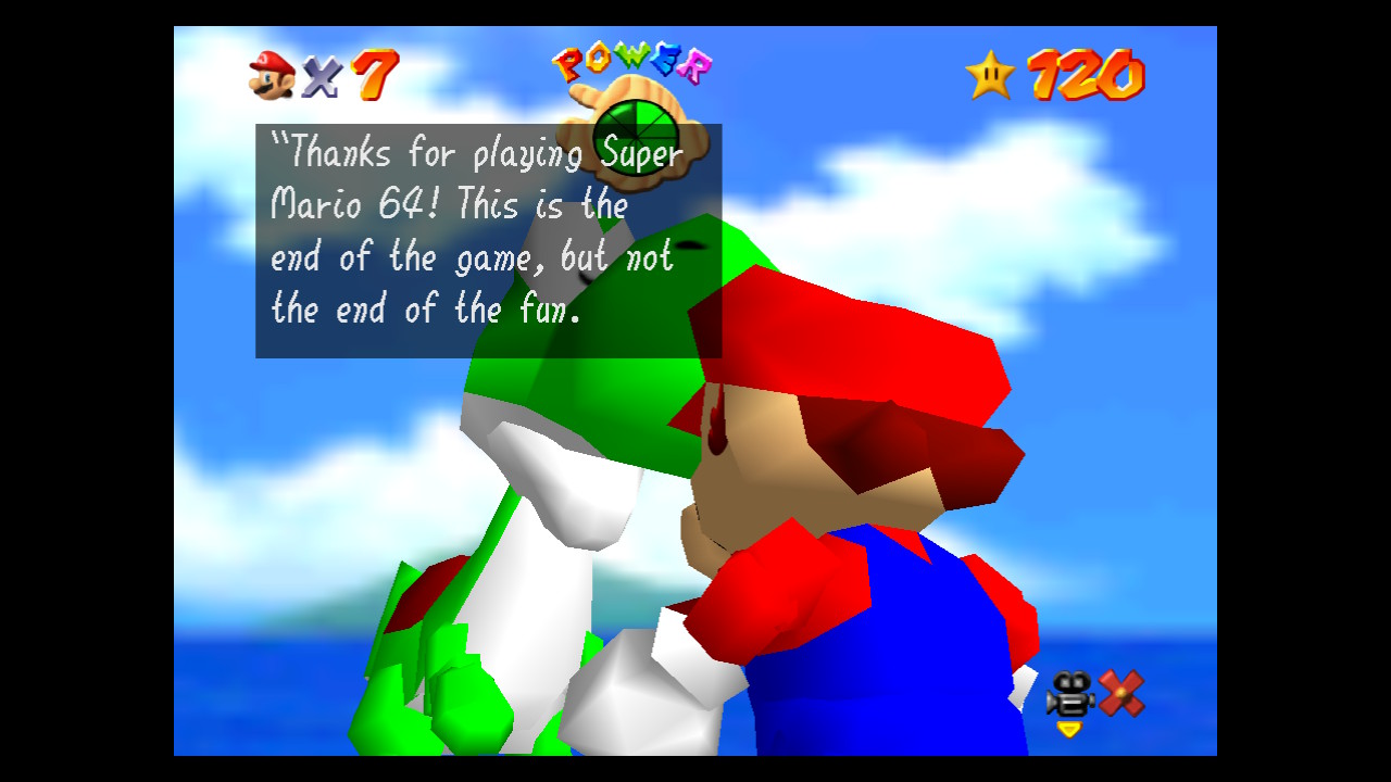 3D 어드벤처 장르의 지평을 열었던 마리오 64는 두말할 필요 없다. 이 게임은 기념비적이고, 2020년쯤 와서는 훌륭한 고전 세계문학 같은 느낌이라 해 보지 않았고 해 볼 기회가 된다면 플레이해 보는 것이 좋다고 생각함. (당시엔 훌륭했던)투박한 폴리곤, 약간 미끄러지는듯한 조작, 한정적인 시점, 다소 부족한 설명은 현세대 게임들과 비교했을 때는 다소 답답할 수 있겠으나 적응만 된다면 플레이에 크게 문제없을 정도라고 생각한다. 넓은 스테이지를 자유롭게 둘러볼 수 있고, 한 에피소드를 선택해도 획득할 수 있는 스타가 여러개인 경우가 꽤 많아서 생각보다 자유도가 높은 편에 속한다. 이런 점에서는 부분적인 샌드박스형 게임이라 하겠다. 64는 이번이 세 번째 올클리어라 그냥 복습하는 느낌으로 쓱 훑으면서 진행했음.