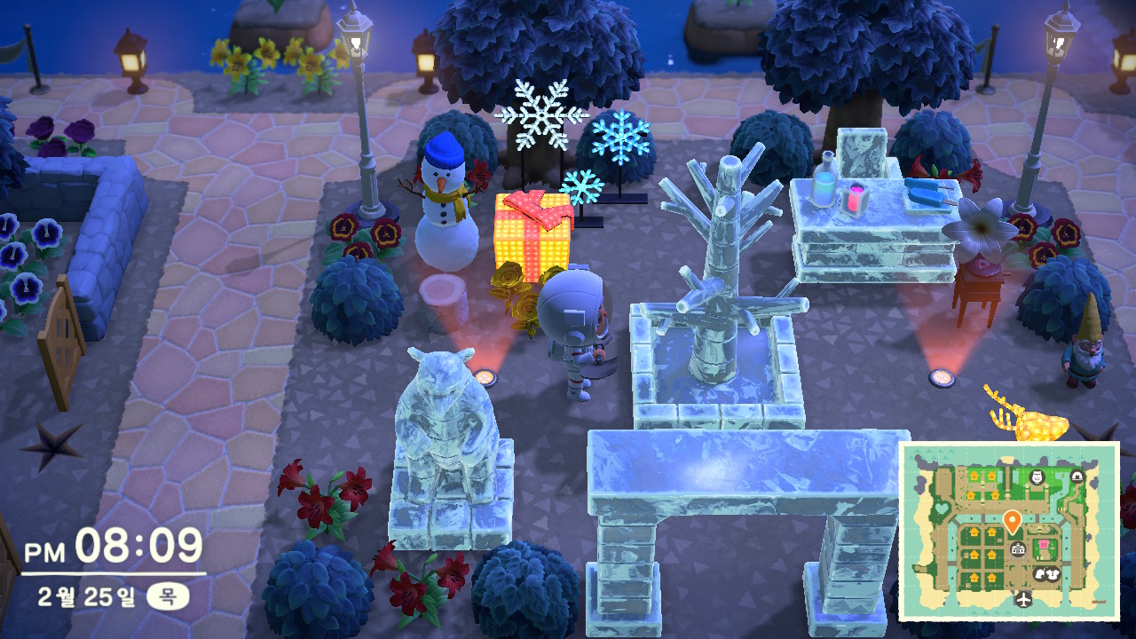 모동숲 시작하고 맞는 네 번째 계절이다. 지금은 접은 롤 제외하면 이런 긴 호흡으로 하는 게임이 잘 없긴 했는데 새삼 게임을 오래 즐겼다 싶다. 비가 올 때는 다음날 구석탱이에 조금씩 피는 꽃을 정리해야 하니 귀찮아져서 싫어했지만 겨울에 눈 내릴 때는 그다지 싫지만은 않았다. 현실에서는 눈은 싫어하고 비를 더 좋아하는데 이와 대조적인 부분이 새삼 재밌군. 마을회관 뒤 자투리 공간은 매 시즌 아이템을 십분 활용하여 주기적으로 새롭게 가꾸어나가겠다는 당찬 포부가 있었지만 번번이 귀차니즘에 막혀 전혀 손을 대고 있지 않았다. 그러다가 겨울 시즌을 맞이하여 새로 추가된 얼음 레시피들이 꽤 괜찮아 보여서 얼음 공원 느낌으로 만들었었음. 나의 센스가 좀 더 좋았더라면, 그리고 좀 더 의욕적이었다면 훨씬 멋들어진 공간을 만들었겠지만 그냥 대충 이 정도로 만들고 치웠다. 근데 왜 눈이 한참 쌓여 있을 때의 사진은 없고 눈이 다 녹은 후의 사진만 있는가... 애통하다. 그냥 이랬다 정도만 참고하자고.
