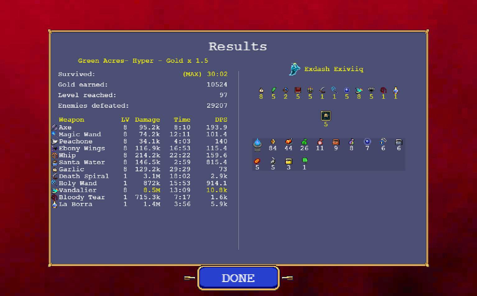 이 게임의 또 하나의 특징은 워낙 게임성이 단순하다 보니 사람들이 여러가지 룰을 만들어서 챌린지를 하고 있다는 것이다. 가장 최근에 화제가 되었던 것은 유령 노업 3맵(Green Acres) 하이퍼 챌린지인데... 기본 스탯들이 모두 낮고 흑둘기라는 애매한 무기만 들고 현 상태에서 가장 어려운 맵을 클리어해야 한다는 것이다. 처음엔 별생각 없었는데 스트리머들이 도전하는 걸 보고 해 보고 싶은 마음이 들어 한 두시간 반 정도 파고들었더니 겨우 클리어했다. 파워업을 아예 안 눌러야 하지만 나는 그 와중에 앵벌이라도 해보겠다고 Greed만 5레벨만 찍었다^^;; 이 챌린지는 순전히 운빨인데 최대한 조합 무기를 빨리 갖춰야 한다는 기본적인 흐름은 동일하다. 3/5개짜리 상자가 초반에 잘 안 나온 편이긴 하지만 도끼나 마법 지팡이 업그레이드가 초반에 빨리 나와서 DPS를 빨리 올려서 클리어할 수 있지 않았나. 각자 나름대로의 방법이 있지만 1) 초반엔 마늘을 얻음과 동시에 나무나 브로콜리(..) 등의 낮은 체력 적들이 나와서 초반 스노우볼을 굴리는 것이 편하다는 것, 2) 무기는 자유롭게 선택 가능하겠지만 장신구 중 시금치와 빈 책(쿨감)을 빨리 확보하는 것이 필수이지 않나. 여튼 그 안에서 유저들이 컨텐츠를 자꾸 만들어 내고, 최근에는 사신 캐릭터가 정식으로 풀리면서 2렙 클리어 챌린지가 새로이 유행을 하는 등 컨텐츠가 마를 날이 없다. 생각보다 유행이 오래갈 것 같은 느낌이다.