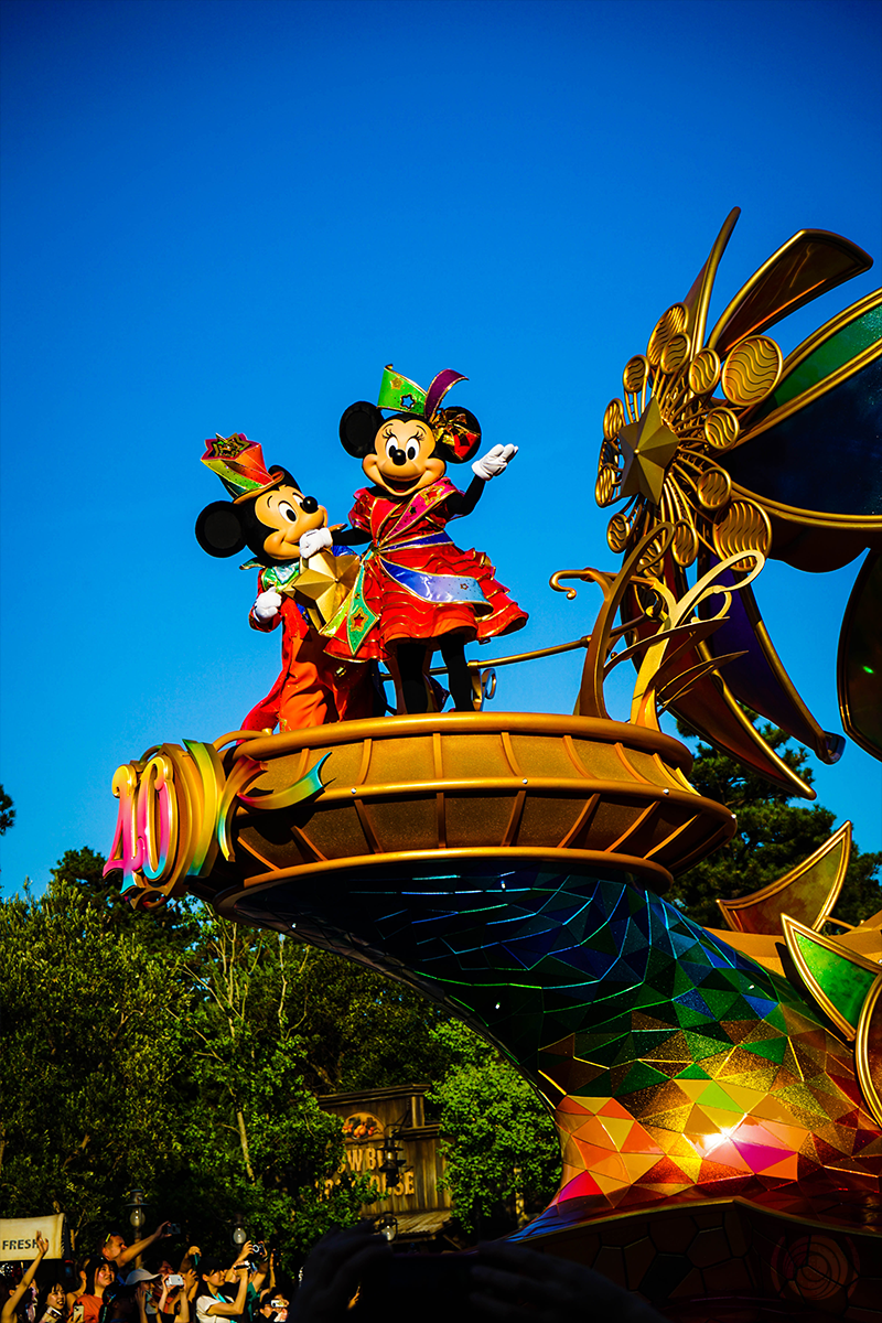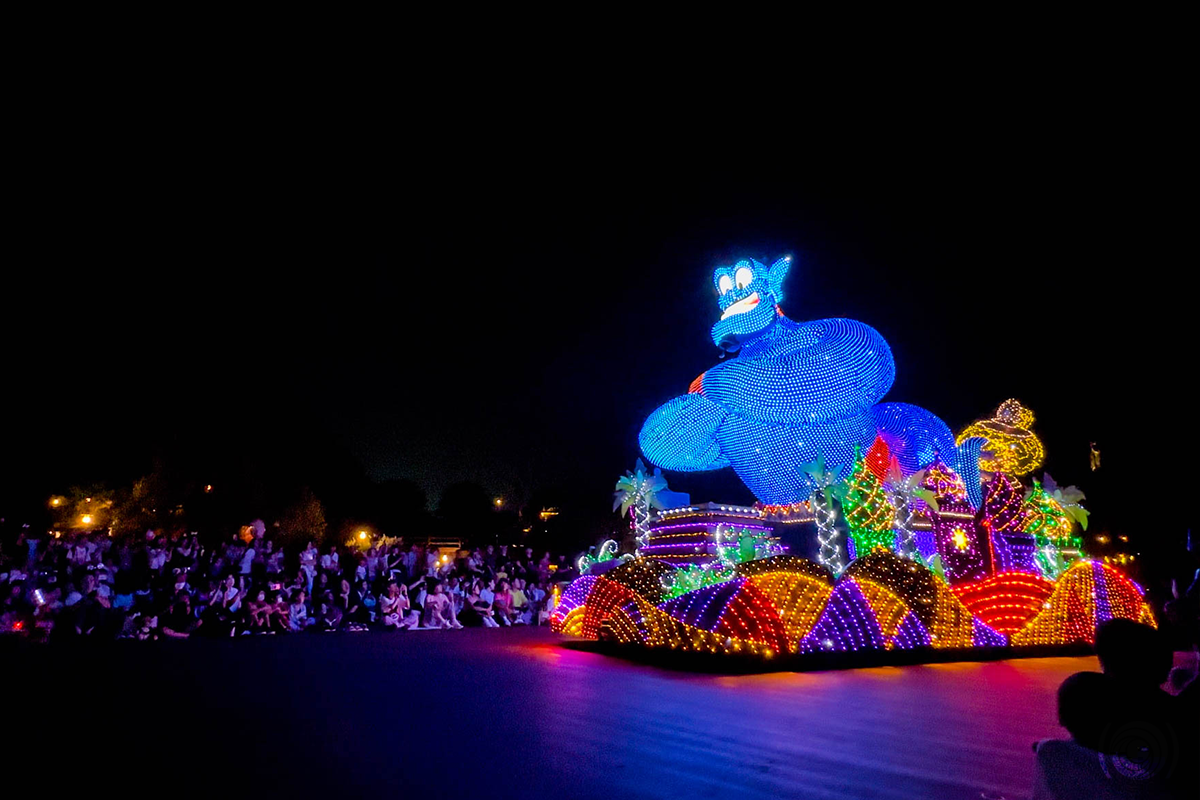 - 일렉트리컬 퍼레이드 드림라이츠 : 하모니 인 컬러로부터 2시간이 지난 오후 7시의 퍼레이드. 전반적으로는 하모니 인 컬러와 비슷하지만 일몰 후에만 즐길 수 있는 일루미네이션은 또다른 느낌을 준다. 도쿄 디즈니랜드에서는 코빼기도 보이지 않던 엘사와 안나가 여기서만 나온다. 이것저것 다 볼 만 하지만 가장 인상깊었던 파트는 시시각각 모습을 바꾸며 다른 디즈니 캐릭터를 패러디하는 지니였다.