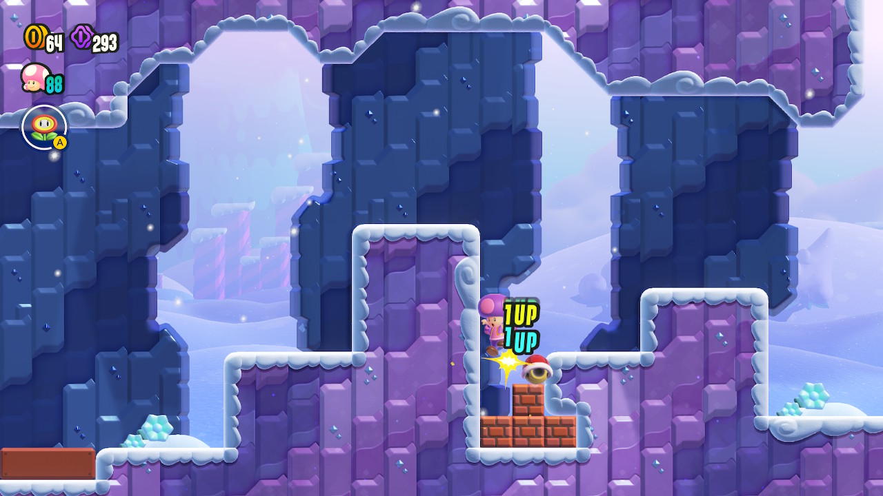 마리오 특유의 몽실몽실한 아트 스타일은 그대로다. 여기에 UI/UX가 이전 작품들에 비해 확실히 단순하고 깔끔해진 점이 두드러진다. 이를 제외하면 현세대 AAA급 타이틀과 비교했을 때 시각적으로 훌륭하다는 느낌은 없다. 스위치의 기기 한계와 닌텐도라는 회사의 방향성을 생각하면 늘 그러려니 한다. 그런 와중에도 닌텐도는 디테일에 공을 들였다. 우선 뉴 마리오브라더스 시리즈 내내 우려먹던 모델링과 모션을 일신했다. 걷기, 달리기, 점프 모션과 더불어 파워업 종류마다 다른 고유 연출이 모두 맛깔난다. 단순히 모션만 개선된 것이 아니라 모션을 취하는 캐릭터의 표정 또한 디테일하다. 플레이어 캐릭터뿐만 아니라 적의 모션도 개선되었다. 이제는 굼바가 접촉하는 플레이어를 확실히 물어버린다. 더불어 각 모션을 뒷받침하는 사운드 이펙트도 공을 들였다. 일례로 캐릭터마다 점프 소리가 다르다. 심지어 게임 상황에 맞추어 스피커가 없는 컨트롤러에서 진동을 이용한 소리도 난다. 이런 디테일함은 최근 개봉한 <슈퍼 마리오 브라더스(2023)(#)>을 다분히 의식한 느낌이 있다. 실제로 제작진은 영화를 보고 유입한 플레이어들에게 실망을 주지 않기 위해 아트 스타일에 더욱 공을 들였다고 한다.