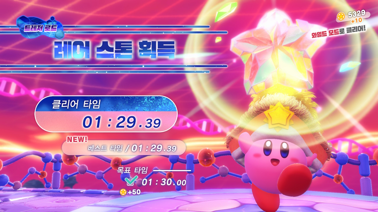 이런 쉬운 커비임에도 미니 챌린지 미션인 트레저 로드는 의외로 부담이었다. 카피 능력이나 머금기 변형을 적극 활용하여 스테이지를 빠르게 돌파하는 방식으로 메인 스테이지와는 달리 시간제한이 있다. 그래도 단순히 클리어가 목적이라면 어렵지는 않다. 하지만 트레저 로드에는 '목표 타임'이라는 시스템이 따로 있다. 이를 달성하기 위해서는 지형이나 적 등장 패턴 등을 고려한 효율적인 플레이가 반드시 필요하다. 그러나 아무리 노력해도 목표 시간을 돌파할 수 없는 경우가 간혹 있다. 이런 건 대부분 카피 능력의 추가 조작법까지 활용해서 시간을 극한으로 단축해야 하는 경우다. 그렇지만 이 게임의 빈약한 튜토리얼 덕분에 이런 조작법을 알아내기 전까지는 절대 성공할 수 없다. 가장 황당했던 게 파이어 계열로 플레이 시 심지에 불을 붙이고 대포 안에 미리 들어가는 것까지가 일반적인 플레이인데, 여기서 B버튼을 누르고 있으면 심지가 더욱 빨리 타오른다. 안 가르쳐 주면 이걸 어떻게 아냐😅 그래도 보상도 확실하고 추가 목표도 적당히 어려웠던 덕분에 메인 스테이지보다 트레저 로드를 더욱 재밌게 플레이했다.