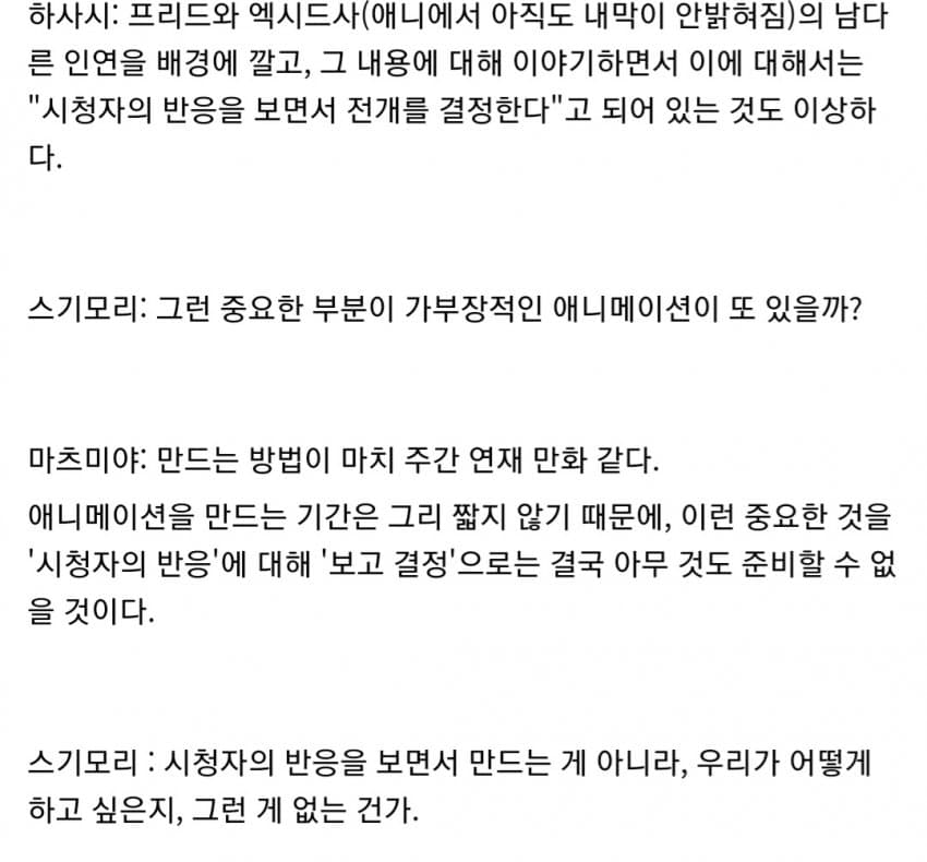 방대한 양의 회의록. 구구절절한 텍스트는 딱 한 문장으로 축약이 가능하다. IP에 잡아먹힌 본가. 포켓몬의 흥행에는 애니메이션이 크게 기여했기에 포애니 사업을 무시할 수 없다지만 어디까지나 미디어믹스는 부수적인 것이다. 포켓몬스터의 태동부터 포켓몬을 이루는 주류는 게임이다. 그러니 애니메이션의 전개를 위해 본가의 설정이나 개발 단계를 훼손하는 일은 없어야 한다. 하지만 이런 생각은 어디까지나 나같은 겜붕이의 입장이다. 이제는 거대한 산업이 된 포켓몬이 그 사업을 굴려 가는 방향을 쉽게 휘어잡기란 어렵다. 큰돈이 오가는 이야기이니 만큼 애니메이션도, 굿즈도 각자의 사정이 있을 것. 다만 이번 사태 이전에도 리코 체제로의 전환 후 고전을 면치 못하는 포애니였지만 이번 유출로 이미지가 더욱 나락으로 가 버렸다. 하지만 나는 원래 포애니에 별 관심이 없었기 때문에 별 걱정 없이 그냥 그러려니 한다. 오히려 이런 상황은 TPC와 OLM이 좋은 작품을 통해 스스로 돌파해야 한다.