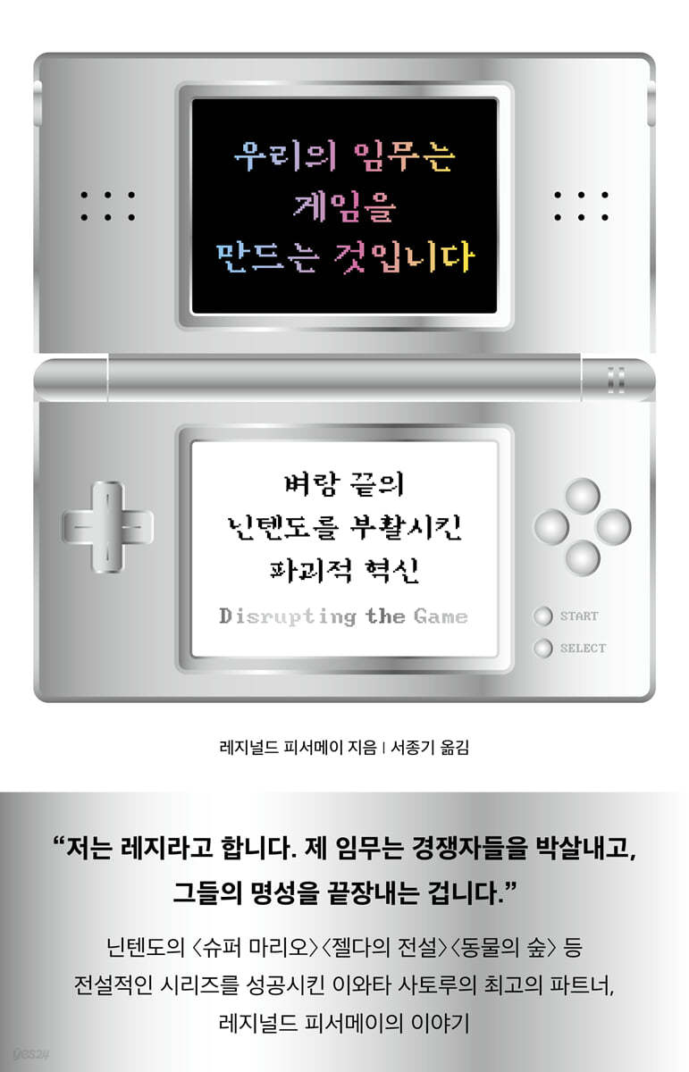 여담으로 그가 강조하는 파괴적 혁신의 의미가 담긴 원제 'Disrupting the Game'과는 달리 국내에서 번안된 제목 '우리의 임무는 게임을 만드는 것입니다'는 아마 나 같은 닌텐도 팬을 겨냥해 새롭게 지은 것 같다. 책 표지도 한때 센세이션을 일으켰던 닌텐도 DS다. 원제 그리고 책 전체가 목놓아 소리치는 혁신과는 좀 거리가 있어 보여서 조금 별로였다. 하지만 일본에서 번안된 제목 '벼랑 끝에 있던 미국 닌텐도를 부활시킨 남자'를 보고 이런 건 어디서나 똑같구나 싶었다. 심지어 일본판 표지에는 이와타 사토루의 이름도 실려 있다. 그래요. 각국에서 가장 솔깃해할 만한 포인트를 짚어내는 것은 마케팅에서 참 중요하다.